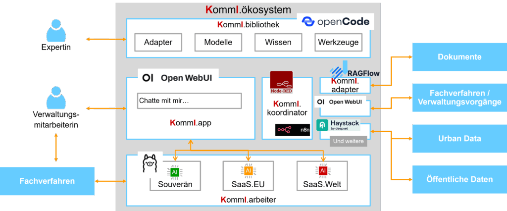 - KommI.koordinator – Der KommI.koordinator koordiniert die Arbeit der Adapter und hilft dabei den richtigen Adapter für die richtige Aufgabe zu verwenden. Hier kommen neben der OpenWebUI-Lösung auch Komponenten wie Ragflow, Haystack, Langchain oder weitere zum Zuge.